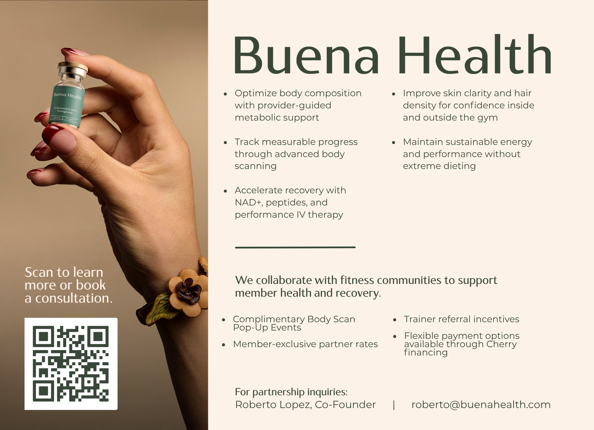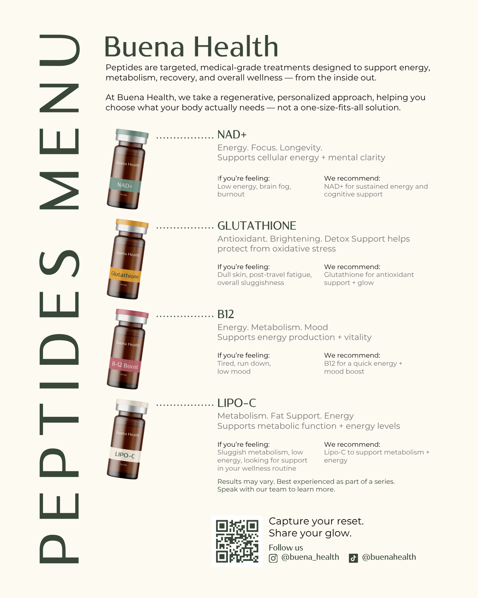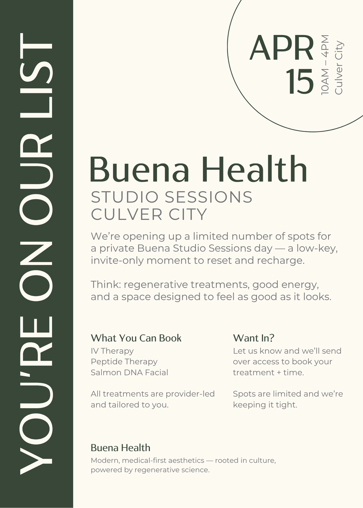 Buena Health is a modern IV drip and peptide therapy studio that turns clinical wellness into a calm, design-forward experience. I led the brand’s visual direction, translating their science-backed treatments into an elevated identity and content across digital and experiential touchpoints.